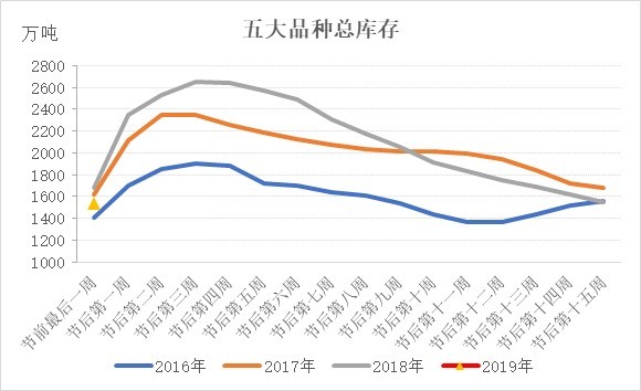 庫存低于去年同期,市場有望出現(xiàn)開門紅行情。根據Mysteel庫存統(tǒng)計數據,2019年春節(jié)前最后一周五大品種庫存雖高于2016年,但低于2017、2018年,尤其是螺紋鋼,總庫存低于2018年同期122萬噸。在產量高于去年同期的情況下,需求是好于去年同期的。市場對節(jié)后需求依舊抱有較大期待。