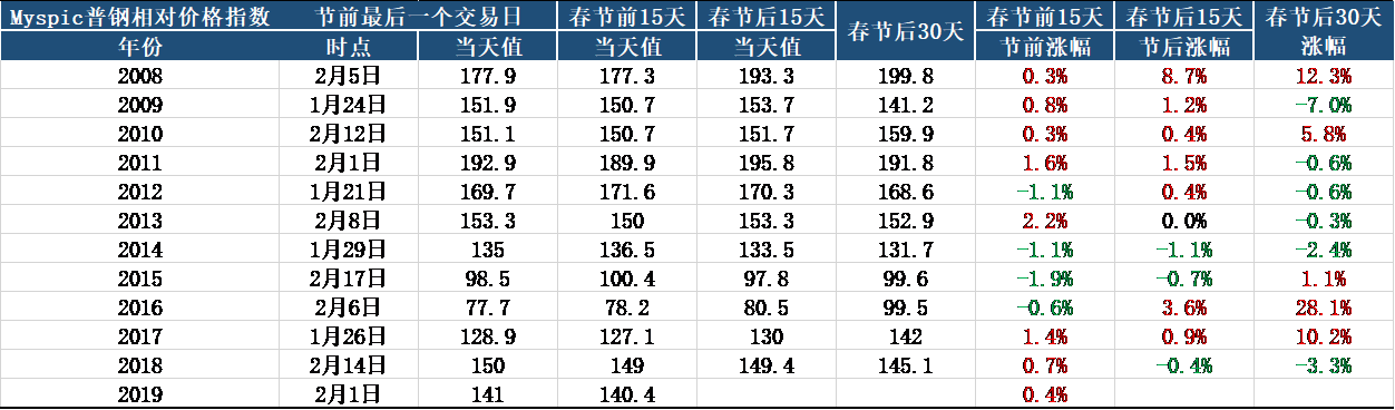具體價格方面,從往年Myspic普鋼先對價格指數的春節(jié)前后對比來看,最近十年有70%的概率節(jié)日前后15日價格漲跌趨勢一致。2019年春節(jié)前15日鋼價指數累計小幅上漲0.4%,預計開門紅行情大概率出現(xiàn)。